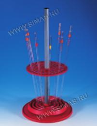Вмещает до 18 пипеток диаметром, не превышающим 10 мм, и 10 пипеток диаметром, превышающим 15 мм. На основании предусмотрены небольшие дренажные отверстия. В комплект входит зажимное кольцо, которое позволяет регулировать высоту стержня на опоре.