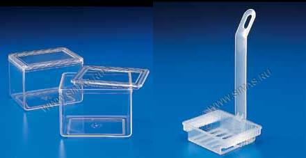 Конструкция этих изделий была специально разработана с целью предотвращения нагромождений, их поломка при установке одной на другую практически невозможна. Каждой ячейке присваивается индивидуальный номер, возможна установка карточек для классификации препаратов. Размеры ячеек для установки предметных стекол составляют 76х26 мм.