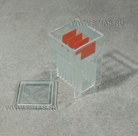 Из АБС-пластика, с прозрачной поликарбонатной крышкой. Вмещает до 100 стекол в вертикальном положении, все ячейки пронумерованы.