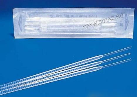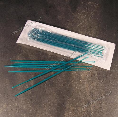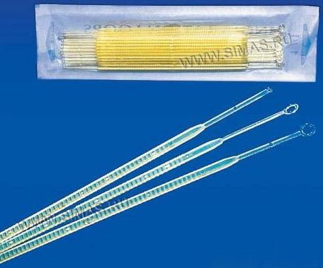 Микробиологические петли в пакетах по 20 шт. Бесцветные изделия снабжены петлей 1-мкл, синие - петлей 10-мкл На другом конце у обеих моделей находится игла для отделения.