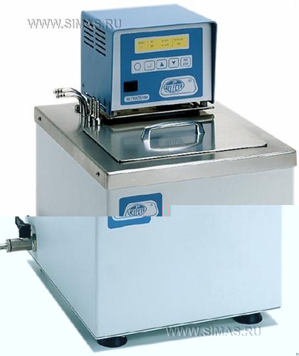 Максимальный объем, в котором поддерживается максимальная температура: 8 литров. Верхняя панель и крышка изготовлены из нержавеющей стали AISI 304, а внутренний резервуар AISI 310. Снабжен насосом для внутренней и внешней циркуляции жидкости через входной и выходной патрубки. Сливной кран расположен на боковой стенке аппарата. Для поддержания температуры ниже комнатной предуcмотрена охлаждающая спираль, подключаемая к водопроводу. Интерфейс RS232 для управления с компьютера и вывода данных на принтер. При работе с низкими температурами – рекомендуется заливать в термостаты – силиконовое масло или 50% раствор этилен гликоля. Для создания низких температур рекомендуется дополнительно с термостатом использовать охлаждающие погружные спирали Фриджедор и Фриджедор Рег.