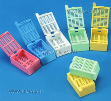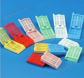 Кассеты для заливки тканей в парафин, универсального типа, с защелкивающейся, легко снимаемой крышкой. Выпускаются следующие цвета: белый, синий, желтый, зеленый, розовый и красный.