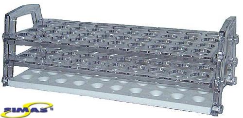 Двухуровневый штатив для пробирок, цветовая гамма представлена четырьмя цветами; представляет собой универсальную опору, выдерживает автоклавирование, может использоваться как в сухой среде, так и на водяной бане и в морозильной камере. На каждом штативе имеются выгравированные буквенно-числовые изображения, облегчающие распознание образцов.