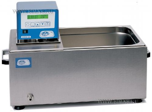 Максимальный объем, в котором поддерживается максимальная температура: 8 литров. Верхняя панель и крышка изготовлены из нержавеющей стали AISI 304, а внутренний резервуар AISI 310. Снабжен насосом для внутренней и внешней циркуляции жидкости через входной и выходной патрубки. Сливной кран расположен на боковой стенке аппарата. Для поддержания температуры ниже комнатной предуcмотрена охлаждающая спираль, подключаемая к водопроводу. Интерфейс RS232 для управления с компьютера и вывода данных на принтер. При работе с низкими температурами – рекомендуется заливать в термостаты – силиконовое масло или 50% раствор этилен гликоля. Для создания низких температур рекомендуется дополнительно с термостатом использовать охлаждающие погружные спирали Фриджедор и Фриджедор Рег.