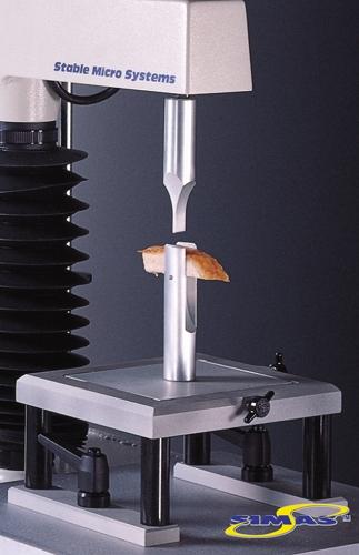 Производитель: Stable Micro Systems Описание:Это приспособление имитирует надкусывание пищи резцами. Состоит из верхней и нижней браншей, закрепляющихся на тензодатчике и основной платформе. Образец размещается на нижней бранше, а верхняя опускается, имитируя сдвигающие силы при надкусывании. Этот инструмент был разработан несколько десятилетий назад для оценки жесткости или мягкости мяса и содержания клетчатки во фруктах и овощах, например, в ревене, спарже и сельдерее. Из-за размера браншей размер образца ограничен 1 см² в сечении.