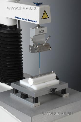 Перед испытанием образец абразивного материала закрепляется на месте самозатягивающимся зажимом. При испытании кронштейн анализатора текстуры протягивает образец под цилиндром и вокруг него под углом 90°, при этом измеряется необходимая для протягивания материала сила. Затем применяется макрос программы для анализа полученных пиков силы и выполняются специальные вычисления для оценки пригодности продуктов для конкретного исследования.