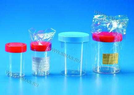 Контейнеры из полипропилена по от 150 до 200 мл с завинчивающейся крышкой предназначены для сбора мочи. Нестерилизованная версия поставляется с голубой крышкой и во множественной упаковке. Стерилизованная и асептическая - с красной крышкой, наличием специальной сатинированной поверхности для надписи, в индивидуальной упаковке.