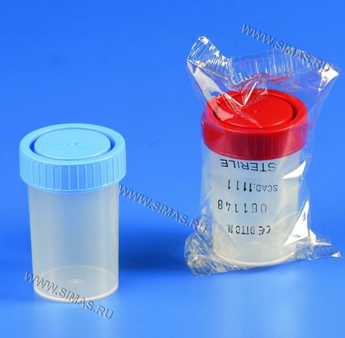 Контейнеры из полипропилена по 60 мл с завинчивающейся крышкой предназначены для сбора мочи. Нестерилизованная версия поставляется с голубой крышкой и во множественной упаковке. Стерилизованная - с красной крышкой в индивидуальной упаковке.
