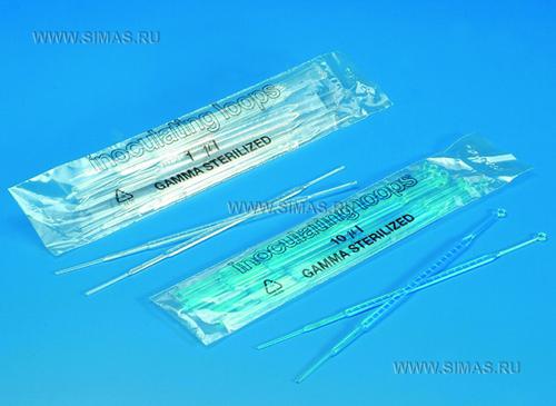 Микробиологические петли в пакетах по 20 шт. Бесцветные изделия снабжены петлей 1-мкл, синие - петлей 10-мкл На другом конце у обеих моделей находится игла для отделения.