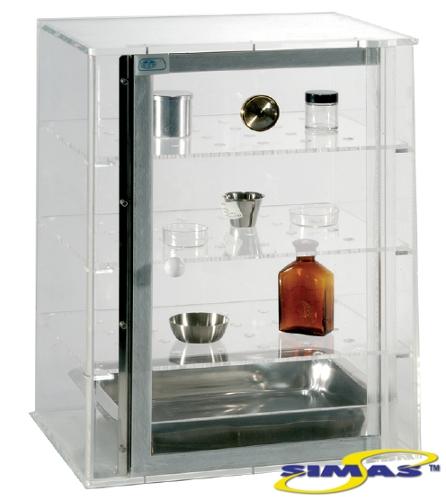 Изготовлен из прочного прозрачного метакрилата толщиной 12 мм. Дверца с силиконовой прокладкой и магнитным замком. Объем 55 л. Размеры: 50 см в высоту х 38 см в ширину х 29 см в глубину. В комплект входит 3 перфорированные полки и поддон из нерж. стали AISI 304 для материалов.